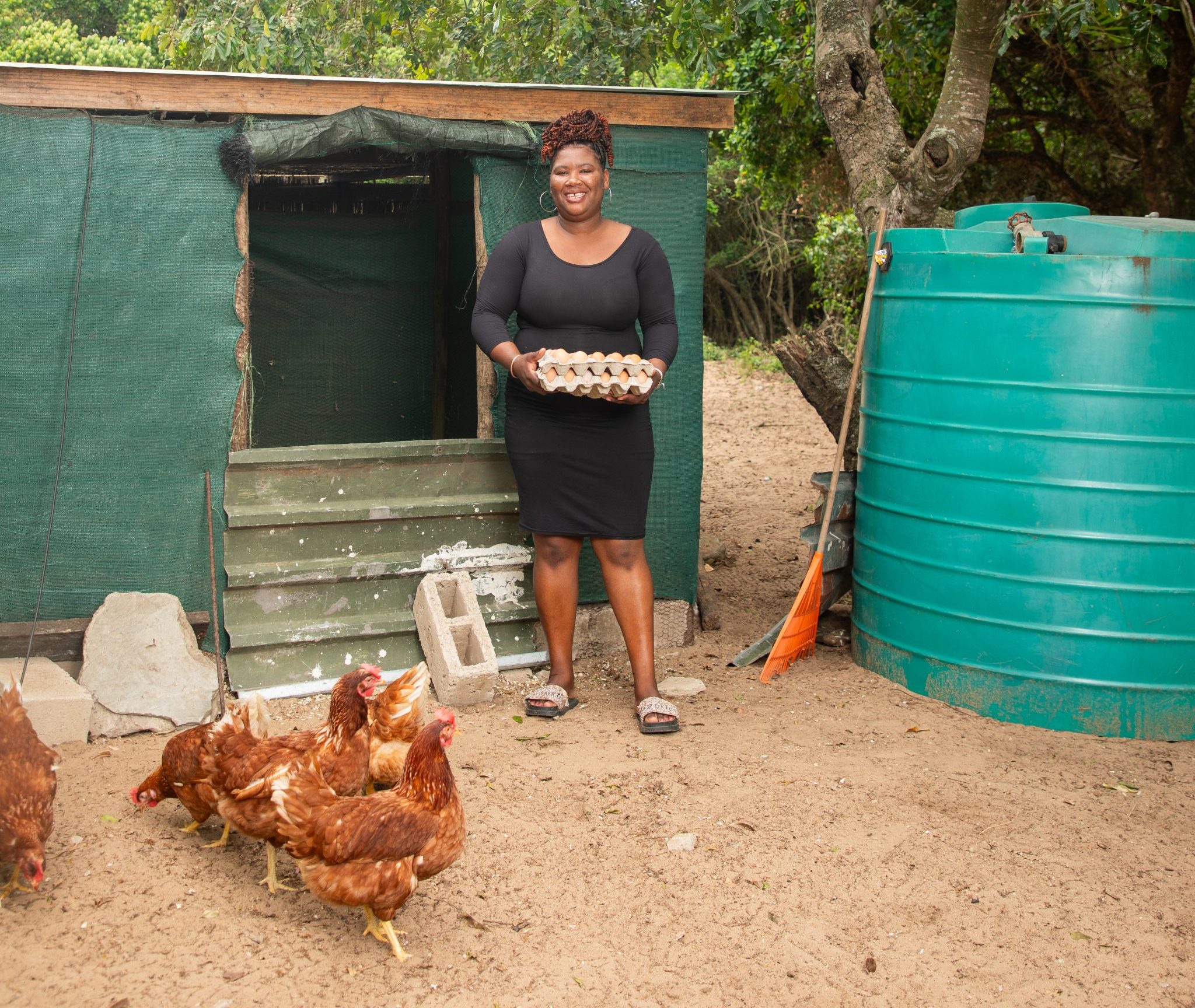 One such entrepreneur is 21-year-old Nokuthula Msweli, founder of Thule’s Poultry Farm in KwaDapha. She launched her broiler chicken farming enterprise with an innovative ecosystem-based adaptation (EbA) approach, cultivating worms as an organic and affordable feed alternative. Her business now provides a vital protein source to the local community, employs two people and supports 14 dependants.