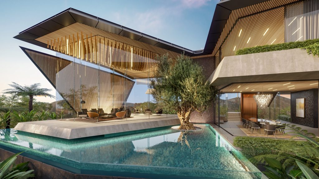Craft of Architecture (COA) created “The Canopy Villa” design for Tatali Views. “Inspired by the beauty of nature, the design of this villa celebrates the concept of a tree canopy. Its distinct sculptural roof gracefully bends and folds, creating an awe-inspiring architectural feat and delivering excitement at every turn,” explain COA directors, John van Wyk and Michal Korycki.
